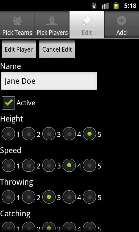 The UF Team Picker was designed for Ultimate Frisbee games (or Ultimate games, since "Frisbee" is trademarked). The app is able to fairly consistently pick a given number of teams with players fairly/evenly distributed, based on 7 different player skills. You can add, edit, and delete players quickly and easily. Players can be set as "active" or "inactive," which means you don't have to continually re-enter players when someone drops out for a while. It's really quick and easy to select who is there (or who is not there; there's an option for if you want to have everyone "present" by default or "absent" by default), too.